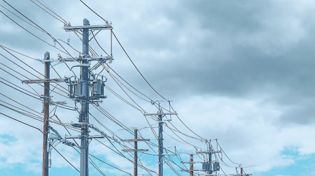A utility pole stands tall with power lines stretching across the cloudy sky highlighting urban infrastructure and connectivity.