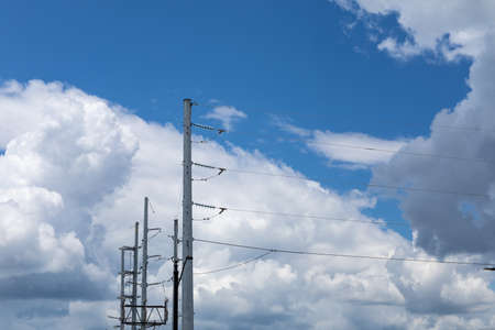 Looking up view of three-phase electric power for transfer power by electrical grids. High voltage electric poles and wire lines against blue sky and white clouds. Electricity for city and factory.