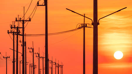 Silhouette row of street lights on electric power poles against colorful sunset sky background in perspective view