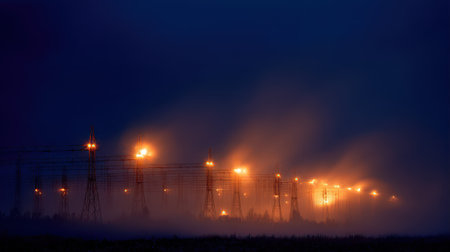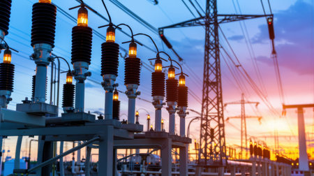 electricity transformation center, power station, electricity distribution point, electricity network, sunset sun rays, horizontal
