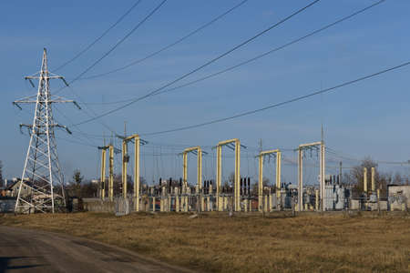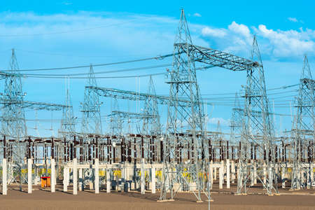 Electric substation of high-voltage power transmission lines electric towers against the background of blue sky.