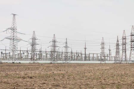 Poles and generator of the power station. A power station that supplies the city with electricity.