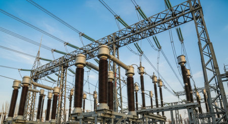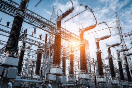 High voltage power substation with transmission lines and modern equipment under blue sky
