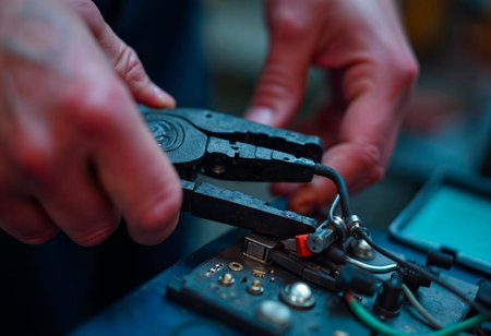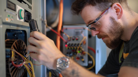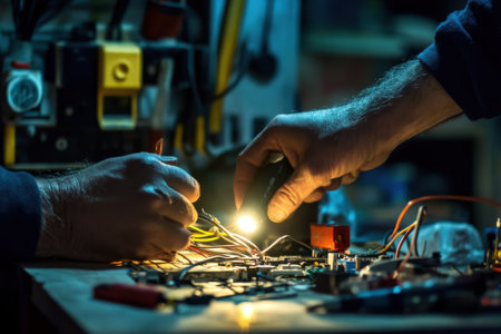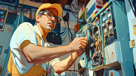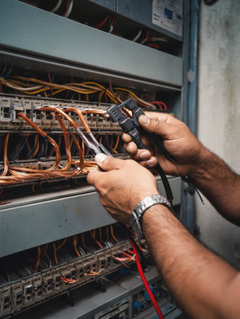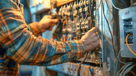 Illustration of an electrician repairing wiring or electrical equipment, close-up. Generative AI.