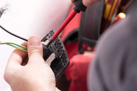 Electrician repairing an electrical panel with a screwdriver. Selective focus.