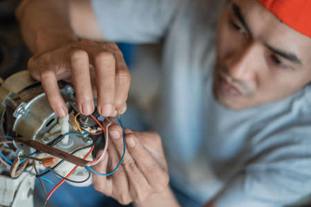 close up of the hand of an asian electronics repairman connecting the broken fan cable