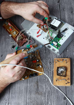 Airplane on the radio control. Repair, soldering iron in the hands of the guy.