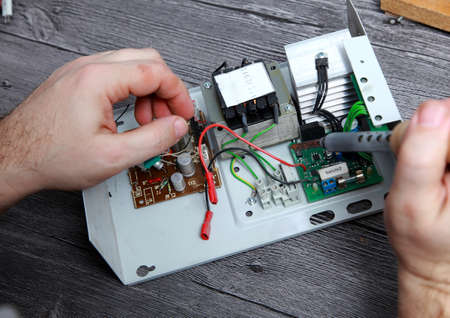 Technician repairing the electronic device. Reparing the audio amplifier. Close up at the orange capacitor.