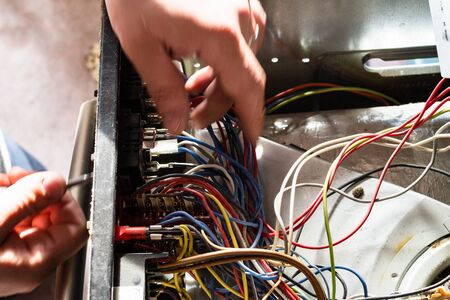 The electrician connected the electrical wires in the electrical control cabinet. The hands of the mechanic is carrying the tool into the electric wire.