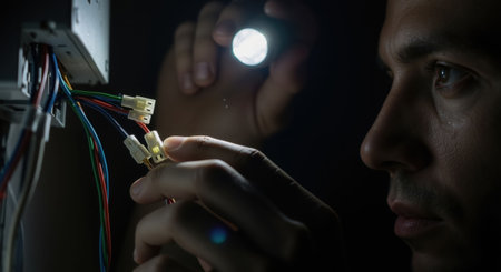 Man examines colorful electrical wires with a flashlight in the dark. HVAC technician performs air conditioner installation. Cooling system repair concept.