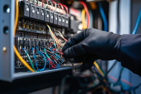 Electrician in black gloves working on electrical panel, connecting wires and fixtures with tools