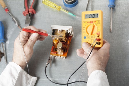 Checking the electrical resistance of the motherboard. Hands using a digital multimeter to test. View from above. Selective focus. Close-up