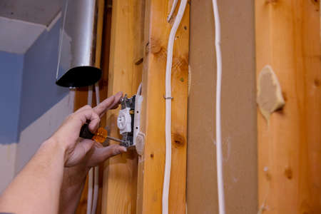 Work on installing electrical outlets with electrical wires and connector installed in plasterboard drywall