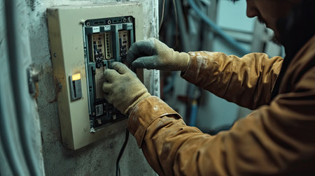 Electric fuse box with a technician wearing gloves performing maintenance in a house