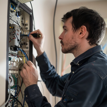 Electrician carefully connecting wires inside a fuse box, performing maintenance on the electrical system
