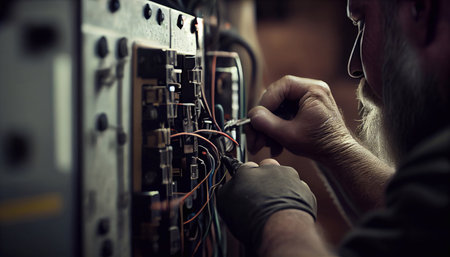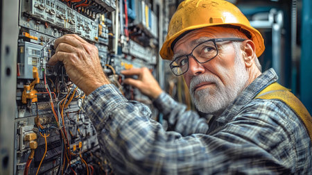In a lively workshop, an elderly technician expertly adjusts electrical panels, showing his skill and dedication.