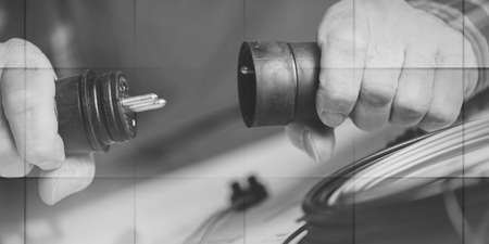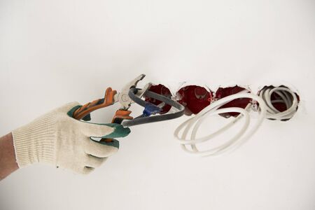 A male electrician changes the plug on an electric wire. Working with electrical tools. Stripper, crimp, screwdriver, wire cutters.