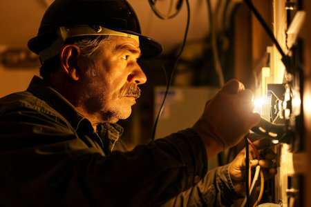 An electrician focuses intently on connecting wires while working inside a home, showcasing hands engaged with cables and an electrical panel.