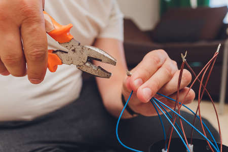 Electrician peeling off insulation from wires - closeup on hands and pliers