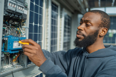 A skilled electrician is carefully connecting wires to a control panel in a solar energy facility.