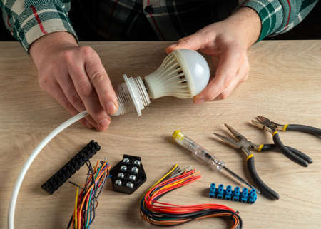 The master electrician turns on the light bulb. Close-up of a worker's hand on the desktop
