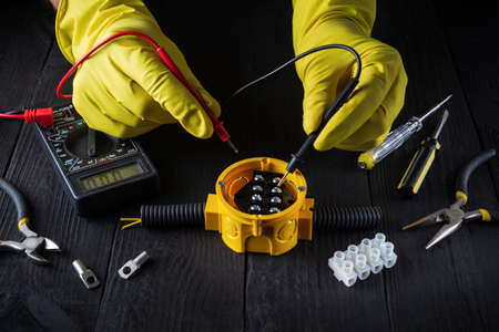 An electrician uses a tester to check the contacts in the yellow junction box. Working environment in the master workshop