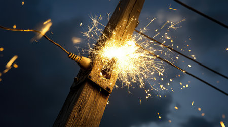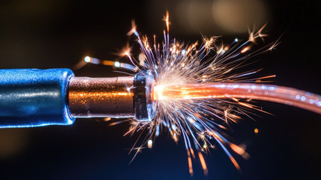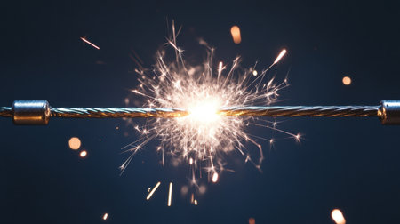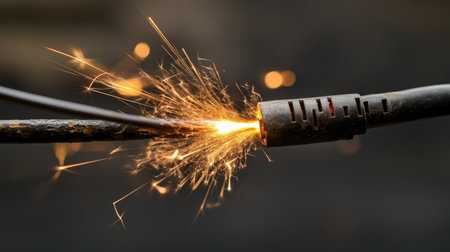 Damaged cable with sparks glowing against a dark background, capturing a high-energy moment of electrical failure