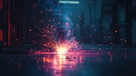 This stunning image captures vibrant sparks emanating from the ground in an industrial setting, creating a mesmerizing interplay of light and color.