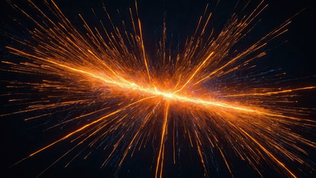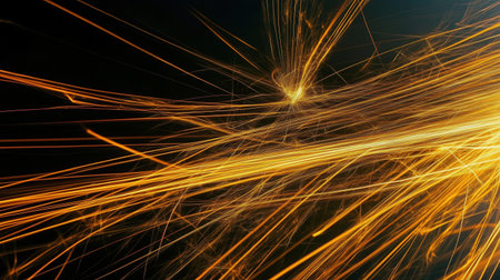 Long streaks of orange sparks flash across a dark space, creating a vivid visual effect. The scene captures a moment of intense energy and movement, showcasing vibrant light contrasts.