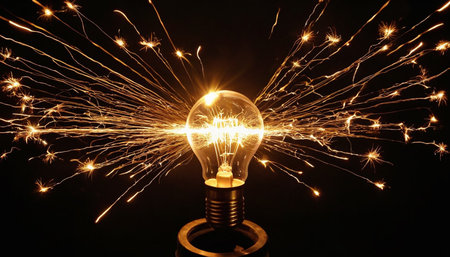 A captivating close-up of a bright light bulb emitting sparks, symbolizing inspiration and innovation in an industrial environment. The image portrays creativity and energy.