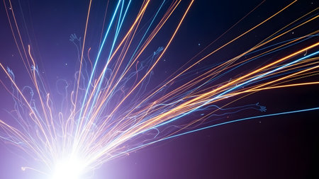 An image showcases vibrant sparks emanating from a network structure against a dark backdrop. The composition features a central burst of light, with connecting lines creating a digital network. This visual style could be used for technology, innovation, or design themes. It features a modern, clean aesthetic suitable for various commercial uses.
