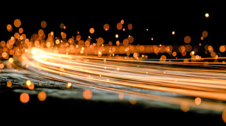 This captivating abstract illustration features glowing light trails and sparkling particles against a dark background, perfect for artistic designs and projects.