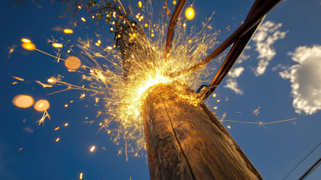 An electrifying explosion of sparks erupts from an electrical transformer on a wooden utility pole, set against a vivid blue sky. This dramatic scene captures the intensity of energy release and industrial power.