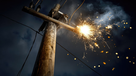 A dramatic scene showcasing sparks erupting from an electric pole as power lines connect in a stormy environment with dark clouds looming.