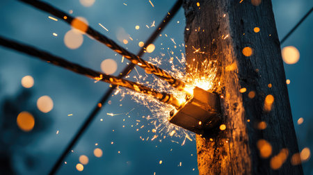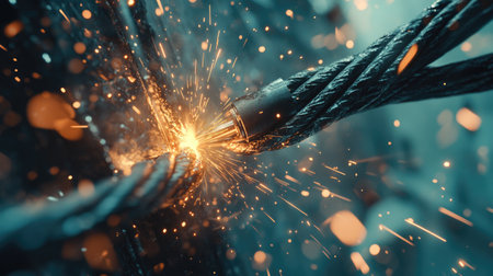This striking image captures close-up details of metal cables producing bright sparks in a dark setting, highlighting energy and tension.