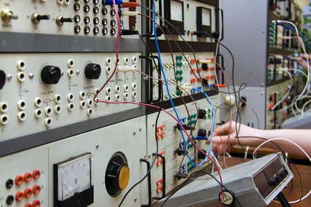 Experiment with electronic components close-up. Breadboard with wires and connectors. Students experience in laboratory.