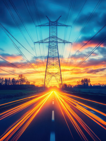 Dramatic Sunset Highway Power Lines Energy Transmission Road sky day blue grid fast rays light speed