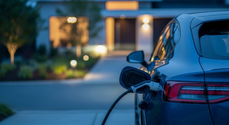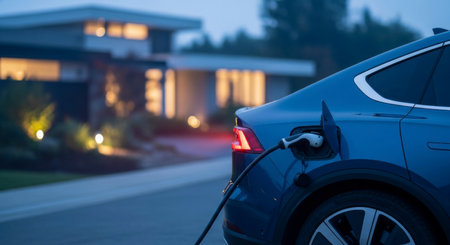A dark blue electric vehicle is charging at home in front of a modern house at dusk, highlighting sustainable energy and smart technology for eco friendly transportation.