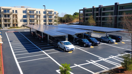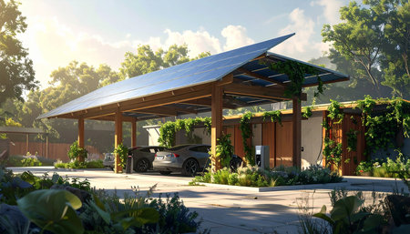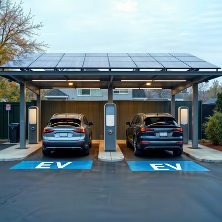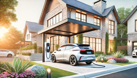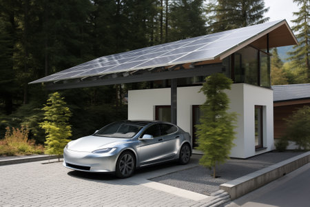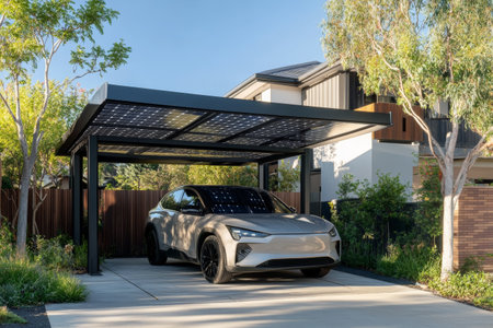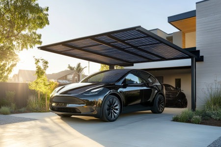 Modern electric vehicle parked under solar panel carport in a suburban neighborhood
