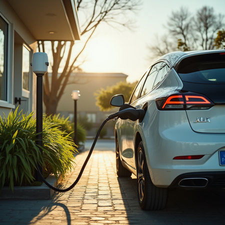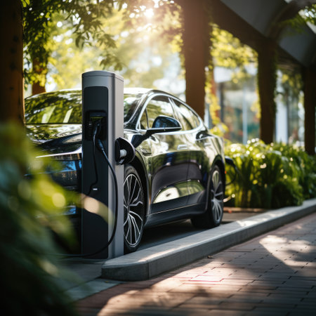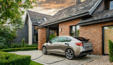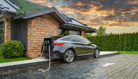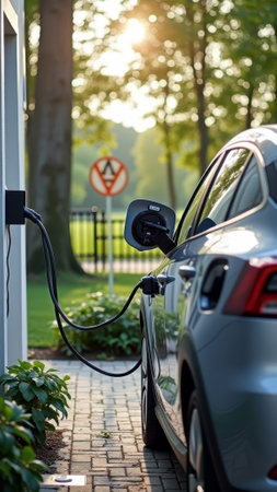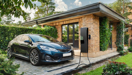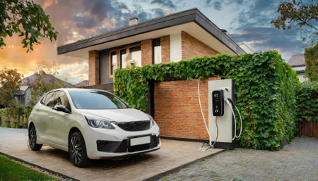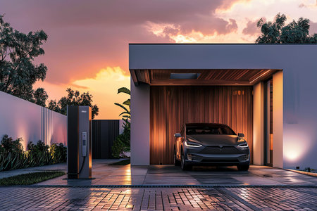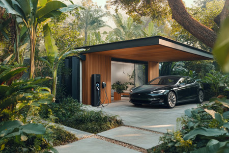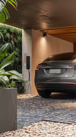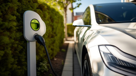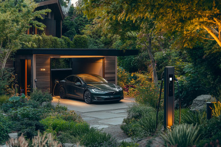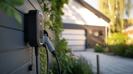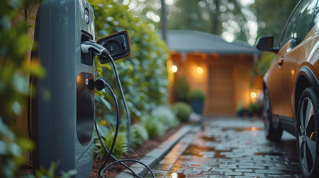 Modern electric vehicle charger beside lush garden and stylish car in cozy residential setting