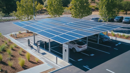 Top-down view of EV charging station with solar panels, highlighting integrated green technologies.