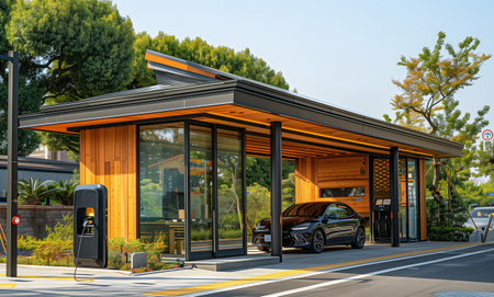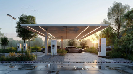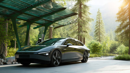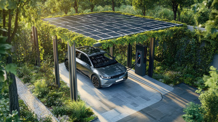 A solar-powered electric car charging station surrounded by greenery, symbolizing innovation and sustainability.