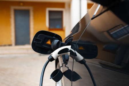Power cable charging an electric car on background of house.