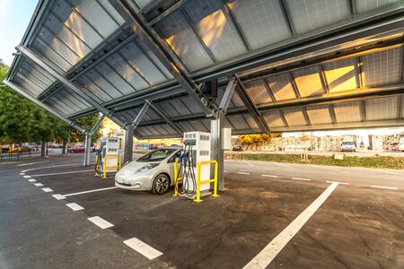 Electric car charging on parking lot with electric car charging station on city street. Electric cars in the row ready for charge.