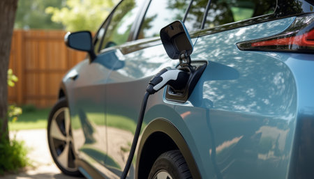 A sleek electric vehicle stands poised for charging, its plug nestled securely in the charging port, basking in the warm glow of sunlight. The vibrant blue exterior gleams against a backdrop of lush greenery and a wooden fence, symbolizing a harmonious blend of technology and nature.