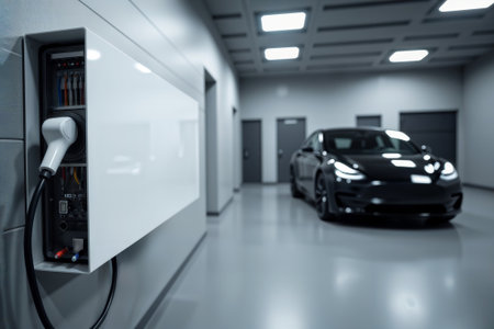 This image showcases a generic electric vehicle EV hybrid car being charged from a wallbox in a sleek, contemporary modern environment, highlighting the future of ecofriendly transportation and energy efficiency.