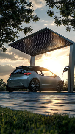 A modern electric vehicle charges at a station sheltered by a solar panel carport, highlighting sustainable energy solutions. The sleek silver car and the grid of solar cells demonstrate the integration of renewable power and clean transportation.