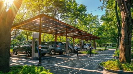 An eco-friendly electric car charging hub, shaded by solar panels amidst lush greenery and sunbeams, showing sustainable technology.