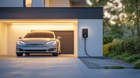 This image showcases a generic electric vehicle EV hybrid car being charged from a sleek wallbox in a contemporary modern home environment, highlighting the integration of sustainable technology in everyday life.