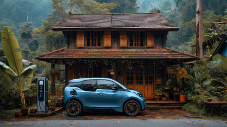 An Ai generative image of old wooden house with electric car and EV charging station insight